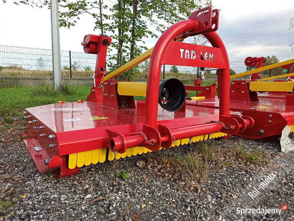 Kosiarko-rozdrabniacz kosiarka sadownicza firmy TAD-LEN 2025 dostępna w szerokościach 1,2 – 2,0m Wysokość cięcia mm 80÷180 Grubość rozdrabnianych gałęzi mm do 40 Skrzynia przekładniowa zębata, kątowa malowana proszkowo ruchome 4 noże, 2 boczne przednie bolce zaczepowe przesuw boczny kręcony na korbę tylne koło podporowe, przednie koła podporowe Dostępne wersję z dwoma przekładniami